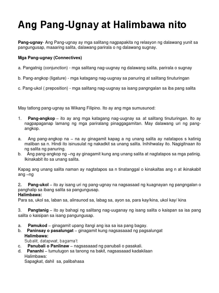 Magandang BuhayNgayon ay matututuhan mo ang ibat ibang gamit ng pang-ugnayPanoorin mo ito at sama-sama tayong matuto. May tatlong uri ng pang-ugnayang pangatnig pang-angkop at pang-ukol. Filipino Unang Markahan Modyul 2 Paggamit ng mga Pang-ugnay Mga Pangatnig at Transitional Devices Ang araling ito ay karugtong sa unang linggo na tumatalakay sa maikling kwentong salin ni Mauro R.
