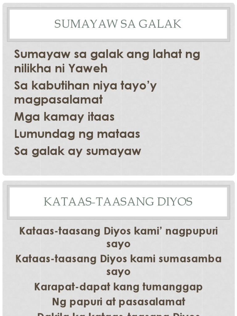 Put your mouse over or tap for mobile devices any Filipino word to see its translation in English. Lahat ng papuri ay Sayo Hindi magbabago Buong puso Kaluluwa Ang aming pagsamba. 1021 views added to favorites 5 times.
